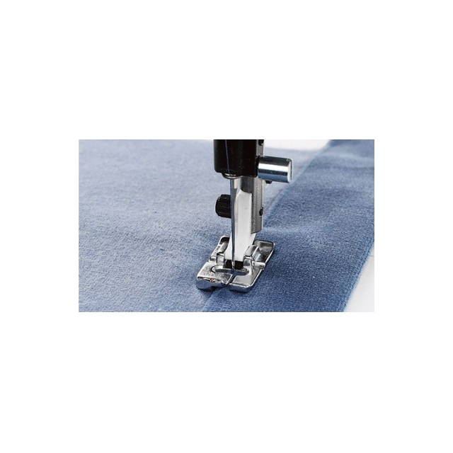 Med den vänstra kantstickningsfoten styr dina kantstickningar perfekt. Använd den inre högra sidan av pressarfoten för att styra tyget. Tillsammans med undersidan av foten som är designad att glida längs den vikta kanten får du en vacker toppsöm på ditt projekt. Använd vänsterkantsstickningsfoten för att fålla skrymmande projekt som gardiner etc. Den gör att du kan ha huvuddelen av tyget till vänster om maskinen för enklare sömnad.
