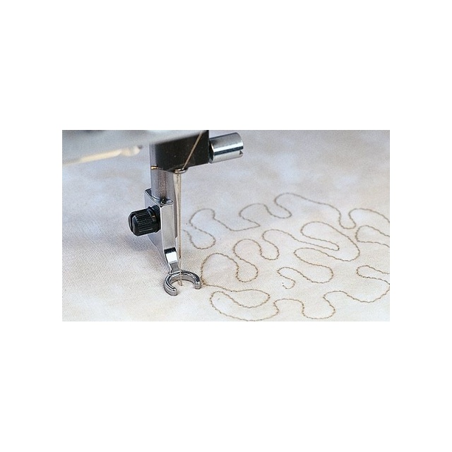 Med den fjädrande öppna pressarfoten för frihandsquiltning är det lätt att se sömmen när du frihandsquiltar eller -broderar. Tack vare det öppna främre partiet följer du lätt ett mönster på tyget. Fjädringen förhindrar att tyget följer med nålen upp, vilket motverkar att tråden går av vid sömnad med specialtråd eller grövre tråd. Se till att använda en lämplig nål för den tråd du använder.