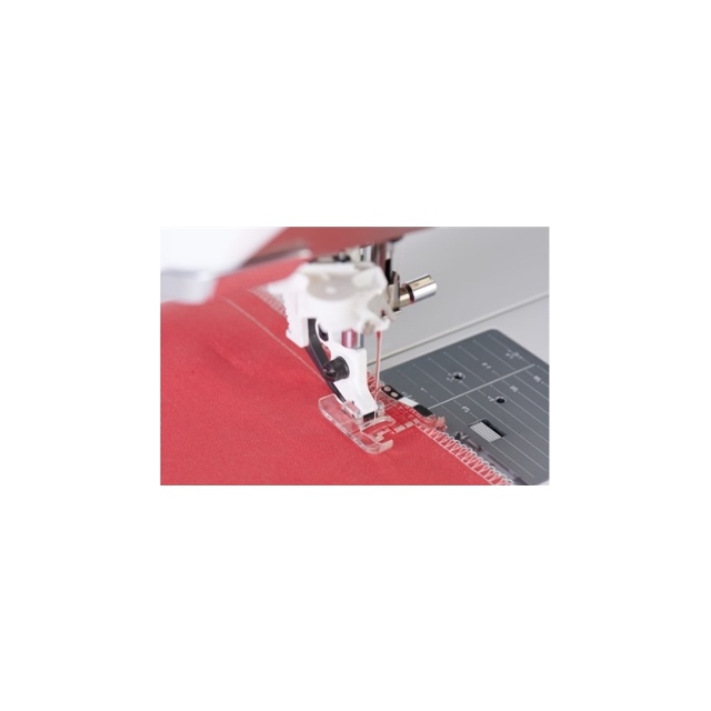 Pressarfoten styr dina sömmar perfekt när du sammanfogar tyger. Pressarfoten är utformad för att hjälpa dig att hålla sömsmånen på samma avstånd från kanten under hela projektet. Pressarfoten har en metallguide på 1,6 cm (5/8 tum) avstånd från mittnålens position, vilket är den mest använda sömsmånen vid klädsömnad. Den har ytterligare fyra markeringar för olika sömsmåner.