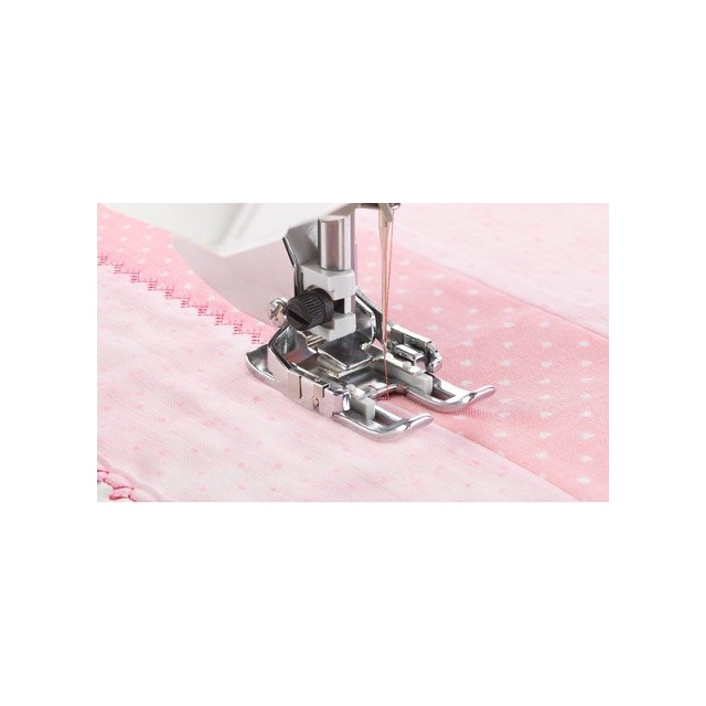 Övermatare med två utbytbara pressarfötter är utformad av en jämn tygmatning och/eller vaddmatning. Den passar perfekt till Quiltning och sömnad i sammet, vissa elastiska tyger, skinnimitation och mönstrade tyger som kräver en noggrann passning. Använd utbytbar öppen pressarfot när du syr application med satinsöm, taperingsömmar och dekorsömmar. Kanalen på fotens undersida matar jämt och den öppna framsidan gör att ser bättre och får en mycket bra överblick på sömmarna.