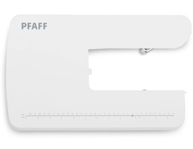 Förlängningsbordet monteras på symaskinens friarm och skapar en plan arbetsyta i nivå med maskinens syyta. Den utökade ytan ger bättre stöd för tyget och gör det enklare att arbeta med större tygstycken under sömnaden.