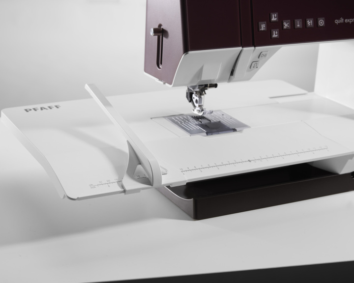 Förlängningsbordet monteras direkt på maskinen och skapar en jämn yta i nivå med friarmen. Den svävande konstruktionen saknar stödben, vilket gör det möjligt att trä mindre och medelstora projekt över bordet. Bordet är utrustat med en justerbar guide som underlättar sömnad med jämna och parallella avstånd.