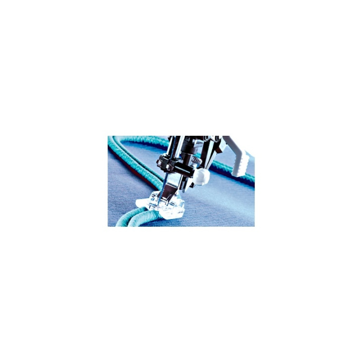8. Lägg den täckta snodden under pressarfotens två spår och sy fast på ditt sömnadsarbete. (ill. C)
