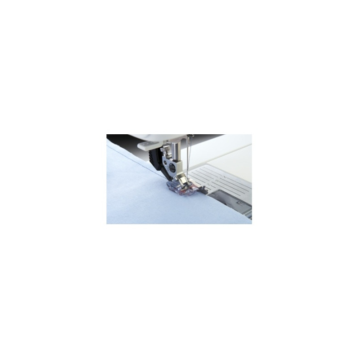 Transparent 1/4 Quiltfot med högerguide är konstruerad så att den underlättar för dig att sammanfoga tyglappar med perfekta 6 mm-sömmar. Mata bara tygkanten längs med guiden. Den genomskinliga foten gör att du ser utmärkt när du syr. Avståndet mellan nålen och högerguiden är 1/4" d.v.s. 6 mm.