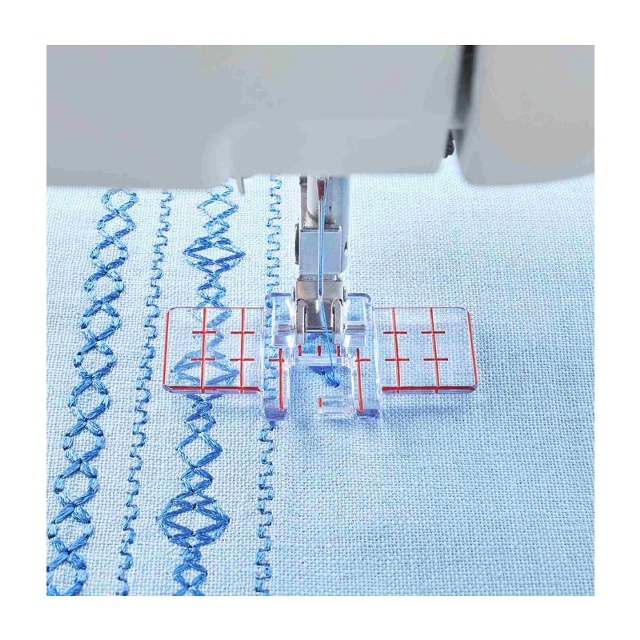 Ge dina projekt en professionell finish med Pfaffs Flerlinjerad dekorfot! Denna pressarfot är perfekt för dig som vill sy jämna och exakt placerade dekorsömmar – oavsett om du syr ton-i-ton eller kontrasterande trådar.