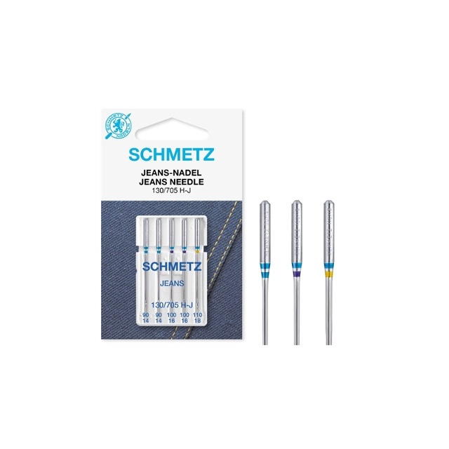 Schmetz jeansnål är en symaskinsnål med medelkulspets som lättare tränger igenom fasta, kraftiga tyger utan att skada materialet. Det förstärkta skaftet förhindrar att nålen böjs och minskar risken för nålbrott och hoppstygn. Nålen passar bra för sömnad i denim och liknande fasta tyger.