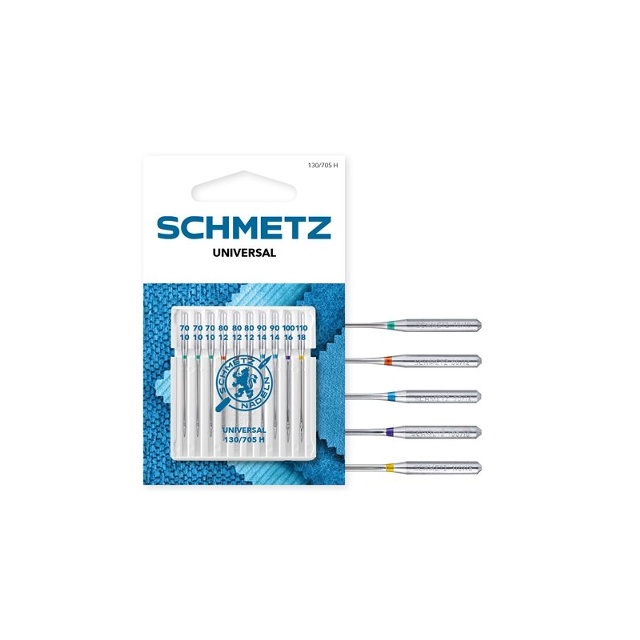 Schmetz universalnål är en symaskinsnål med lätt rundad spets, universalnålen ger en problemfri sömnad i många olika tygkvaliteter och finns i flera olika storlekar.
