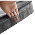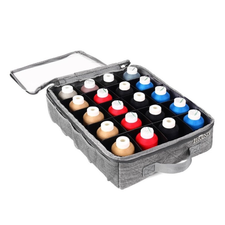I Phoenix trådväska kan overlock trådrullar förvaras och transporteras utan knutar. Det genomskinliga locket gör att du kan se innehållet i väskan och tillbehör kan förvaras i sidofacken. De delade facken är särskilt lämpliga för säker förvaring av nålboxar. Inuti väskan finns avdelare som håller trådrullarna säkert på plats.