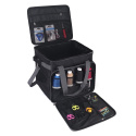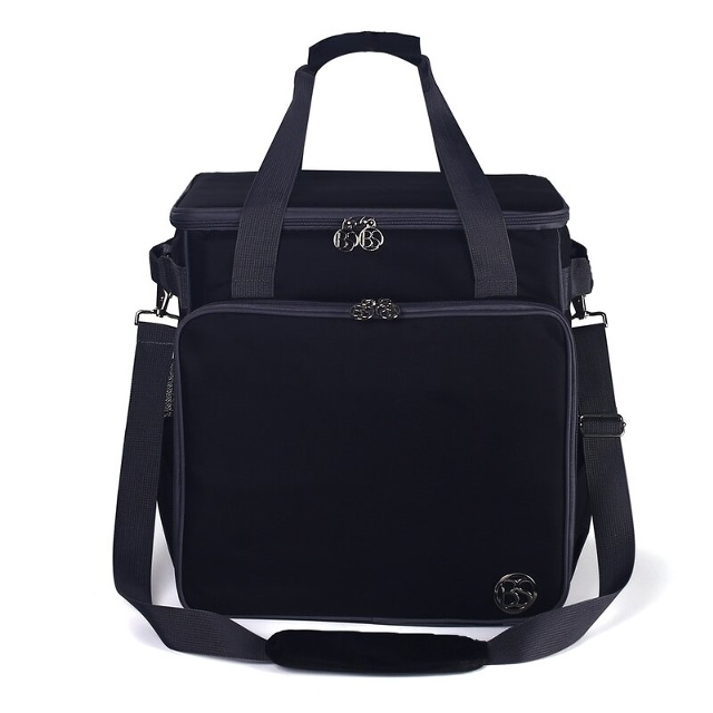 Det finns gott om plats för sömnadstillbehör i de många fickorna och facken som finns i framfickan, i huvudfickan och på sidorna. Den vadderade botten i overlockväskan dämpar stötar som kan skada maskinen och skyddar även maskinbasen från repor. Plastfötterna på väskans botten förhindrar att botten blir smutsig och att maskinen kommer i direkt kontakt med marken. Det lättskötta Oxford-materialet, som fungerar som täckmaterial, är lätt att torka rent och är särskilt robust på grund av sin styrka. Innermaterialet kan även rengöras från damm och grov smuts med en fuktig trasa.