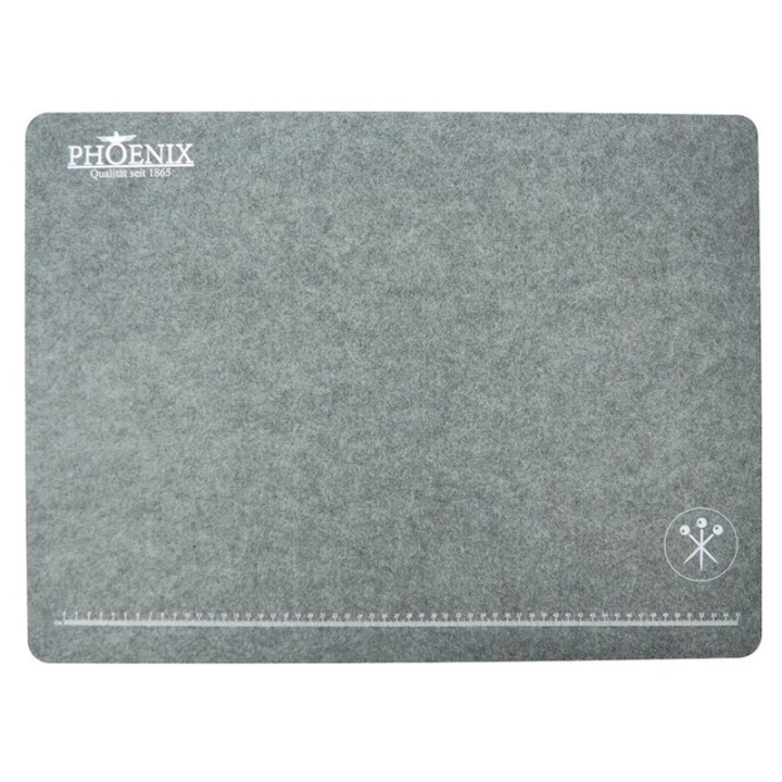 Phöenix bordsunderlägg är en filtskiva som är utrustad med en centimetermarkeringar upp till 55cm och ett speciellt markerat knappnålsområde. Filtmaterialet har en tjocklek på ca 4 mm och möjliggör bekvämt arbete trots sin stabila styrka. Dess undersida är belagd med anti-slip skummaterial som är flexibelt och böjbart. Bordsunderlägget kan även förvaras ihoprullat och transporteras i en påse. Phönix bordsunderlägg kan användas på många olika sätt. Vid sömnad absorberar den vibrationer från maskinen och erbjuder möjligheten att hålla knappnålar inom räckhåll och göra mätningar. Men bordsunderlägget Phönix passar även som skrivbordsunderlägg.