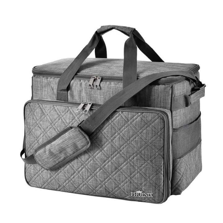 Med sin quiltade framficka och det melerade tyget i trendigt grått kombinerar Phoenix symaskinsväska funktionalitet med snygg design. Den eleganta Phoenix-loggan på framfickan och logotypdetaljerna på blixtlåsdragen ger också ett speciellt blickfång.
