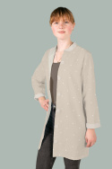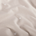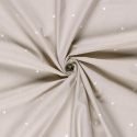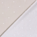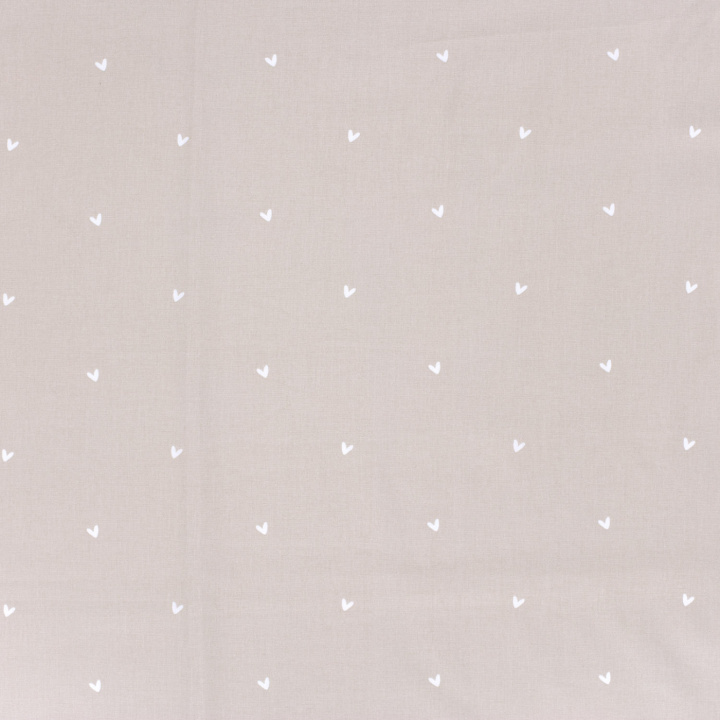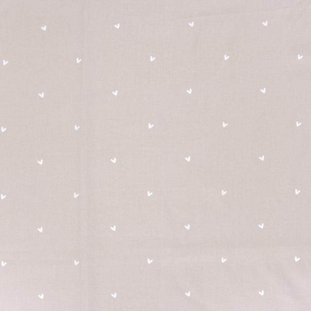 Denna mönstrade bomullspoplin i beige med små vita hjärtan har ett mjukt, lugnt och tidlöst uttryck. Tyget har slät yta och fin stadga, vilket gör det lätt att arbeta med och ger ett snyggt resultat i färdiga plagg.