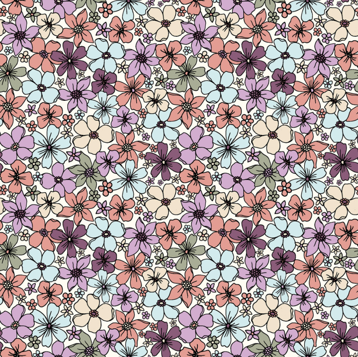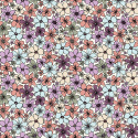 Denna mönstrade bomullspoplin med färgglada blommor på offwhite botten har ett rikt och lekfullt uttryck med blommor i mjuka toner av lila, rosa, aprikos, blått och grönt. Tyget har en slät yta och fin stadga, vilket gör det lätt att arbeta med och ger ett snyggt resultat i färdiga plagg.