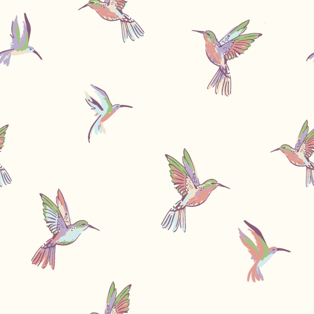 Denna mönstrade bomullspoplin med kolibrier på offwhite botten har ett luftigt och poetiskt uttryck med fåglar i mjuka pastelltoner av grönt, rosa, lila och blått. Motiven är luftigt placerade, vilket ger tyget ett lugnt och harmoniskt intryck.