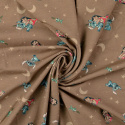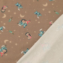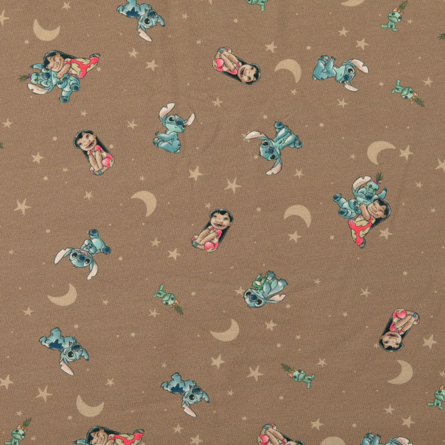 Detta mjuka trikåtyg pryds av ett lekfullt Lilo & Stitch-motiv på mörkbeige botten, dekorerat med månar och stjärnor för en varm och ombonad känsla. Den mörkbeige färgtonen ger ett lugnt och stilrent uttryck som passar fint till både vardag och vila.