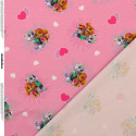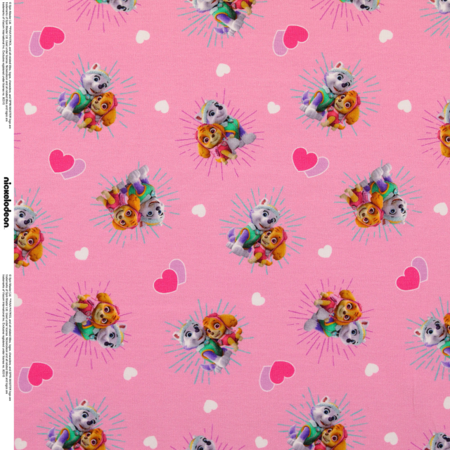 Detta mjuka trikåtyg pryds av ett färgglatt Paw Patrol-motiv på rosa botten, dekorerat med hjärtan för ett extra lekfullt och glatt uttryck. Tyget är elastiskt och behagligt mot huden, vilket gör det idealiskt för barnkläder som ska vara både snygga och bekväma.
