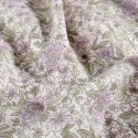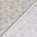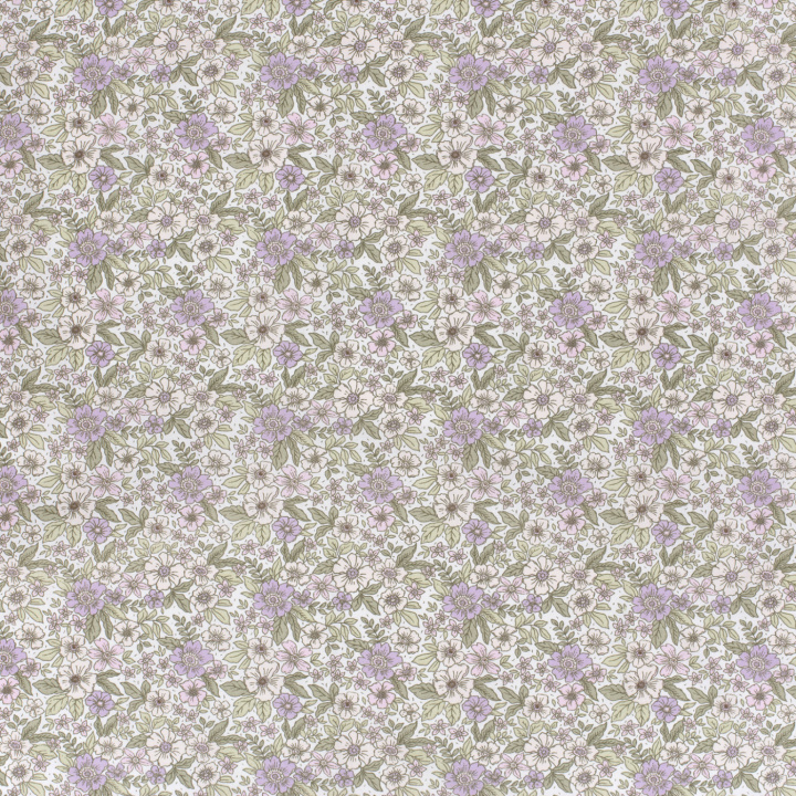 Denna mönstrade bomullspoplin med små blommor i lila och rosa på offwhite botten har ett mjukt och harmoniskt uttryck med inspiration från blommande sommarängar. Blommor och blad i dämpade toner av lila, rosa och grönt skapar ett lugnt men levande mönster.